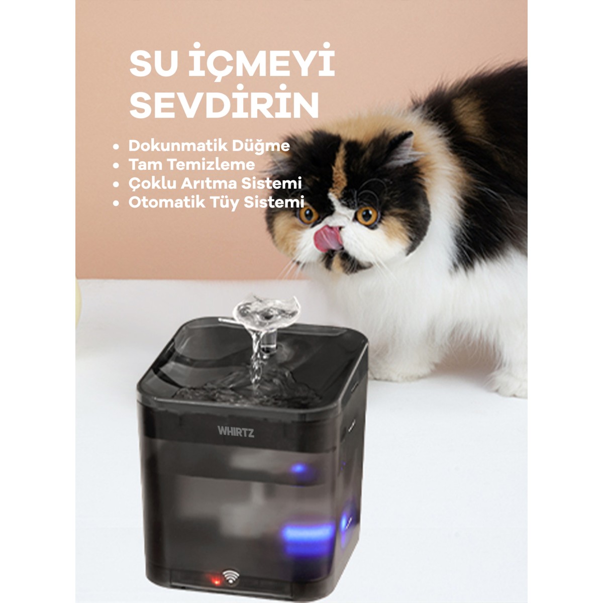 Kediler hareketli/taze suya yönelir. Whirtz 2.2L akıllı su kabı; sürekli dolaşım sayesinde oksijenlenen su sunar ve düzenli su tüketimini teşvik eder.