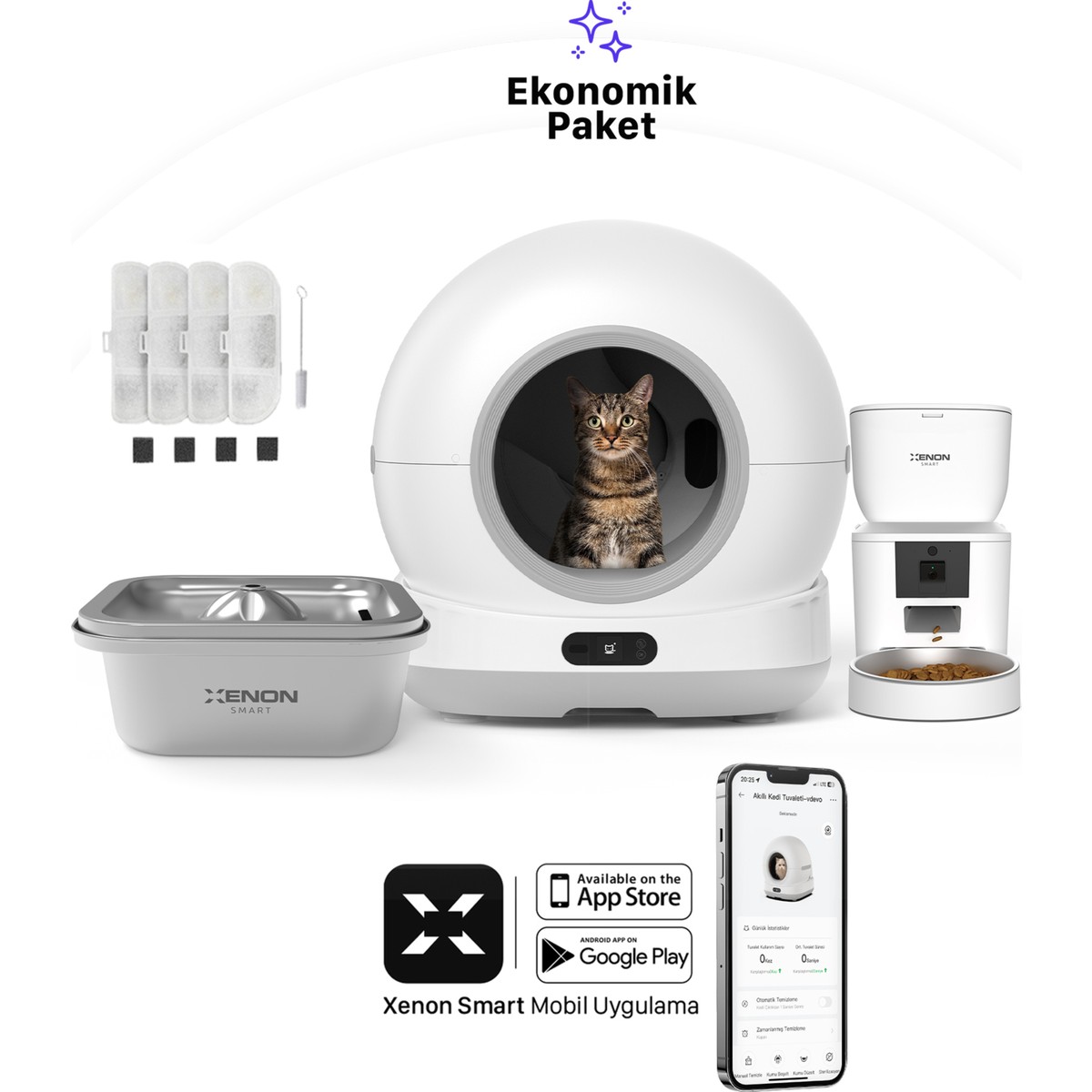 Xenon Smart Akıllı Otomatik Kameralı Kedi Tuvaleti Paslanmaz Çelik Kaseli 4LT Mama Kabı Çelik Hazneli Su Pınarı ve Filtre 4’lü Pet Seti