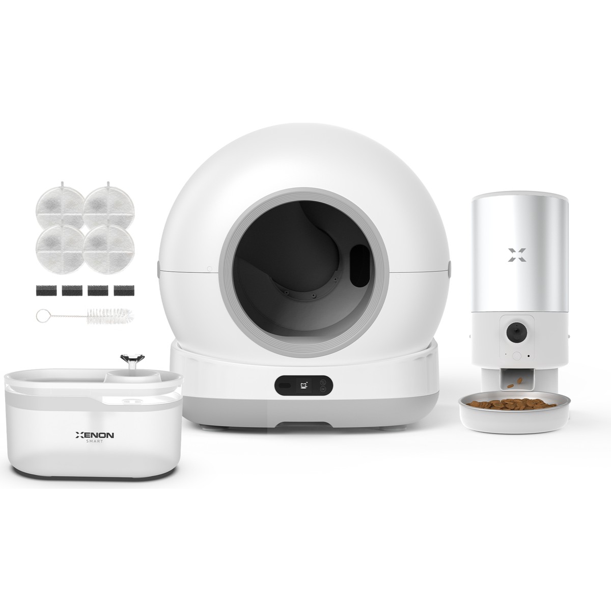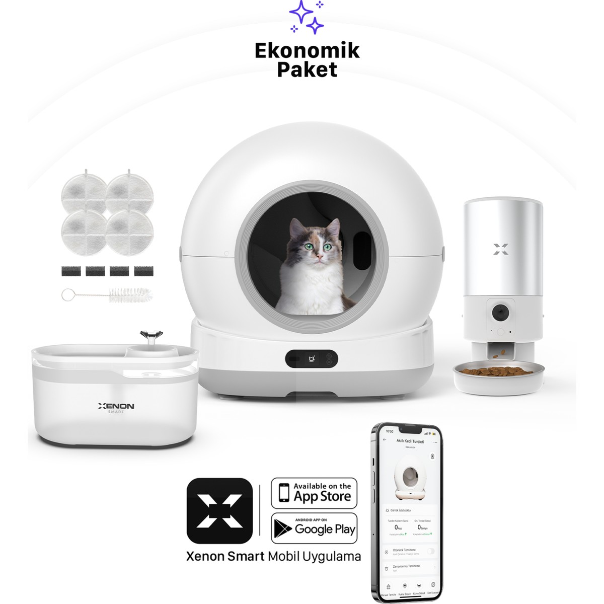 Xenon Smart Akıllı Otomatik Kameralı Kedi Tuvaleti Mobil Uygulama ile Uzaktan Kontrol Edilebilen (Wi-Fi) UV Sterilizasyon Özelliği Olan 72L Hacimli 7L Kapasiteli Kedi Kum Kabı, Koku Tableti ve Çıkarılabilir Kum Paspası Hediyeli Cat Cleaner,Akıllı Otomatik Kedi Köpek Sesli Iletişimli Paslanmaz Çelik Kaseli Kameralı 5LT Hazneli Evcil Hayvan Besleyici Mama Kabı, Akıllı Otomatik Kedi Su Çeşmesi Geniş Hazneli Led Işıklı Su Şelalesi Ultra Sessiz Beyaz Su Sebili ve Yedek Filtre 4’lü Evcil Hayvan Pet Set