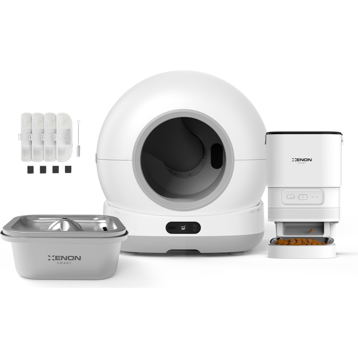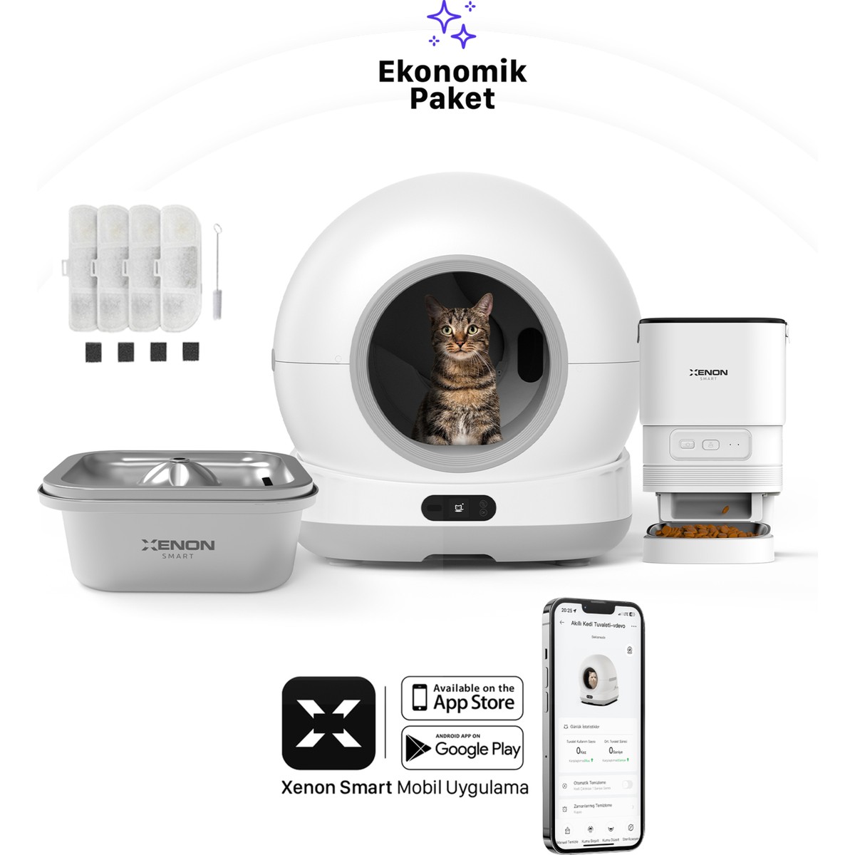 Xenon Smart Akıllı Otomatik Kameralı Kedi Tuvaleti Paslanmaz Çelik Kaseli Mama Kabı Çelik Hazneli Su Pınarı ve Filtre 4’lü Pet Seti